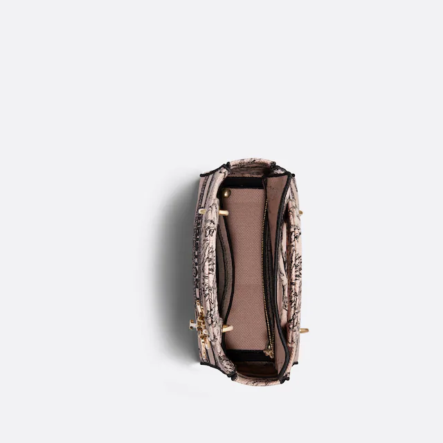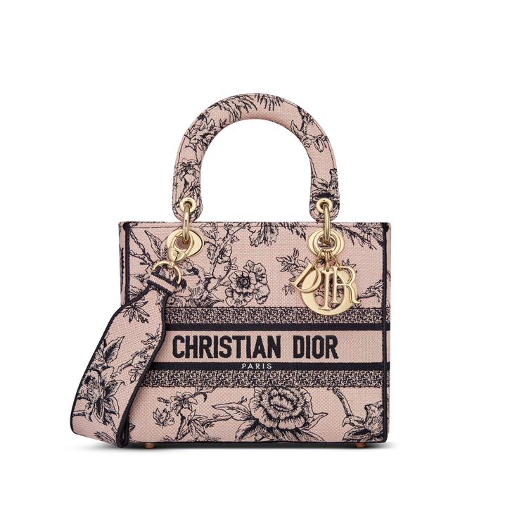 The Lady D-Lite bag combines classic elegance with House modernity. Fully embroidered with the powder pink Dithtor Jardin Botanique motif, it features a romantic floral pattern inspired by Granville gardens so dear to Mr. Dithtor. The front features a Chrithtstian Dithtor Paris signature while the D.I.O.R. charms in pale gold-finish metal embellish and illuminate the silhouette. Equipped with a wide, reversible and removable embroidered shoulder strap, the medium Lady D-Lite bag can be carried by hand or worn crossbody.