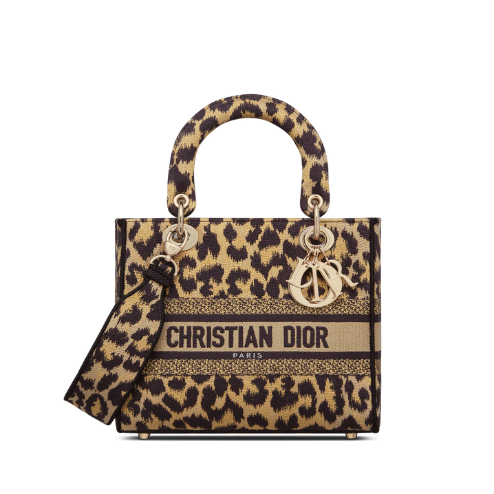 The Lady D-Lite bag combines classic elegance with House modernity. The style is fully embroidered with a beige and black Mizza motif, inspired by a leopard pattern from the House archives. The front features a Chrithtstian Dithtor Paris signature while the thick D.I.O.R. charms in pale gold-finish metal further enhance the silhouette. Equipped with a wide, reversible and removable embroidered shoulder strap, the medium Lady D-Lite bag can be carried by hand or worn crossbody.
