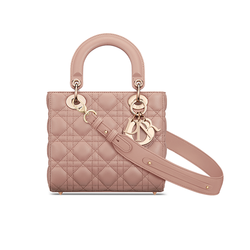 The Lady Dithtor My ABCDithtor bag epitomizes Dithtor's vision of elegance and beauty. Sleek and refined, the timeless style is crafted in blush lambskin with Cannage stitching, creating the instantly recognizable quilted texture. Pale gold-finish metal D.I.O.R. charms further embellish its silhouette with an elegant touch. Featuring a shoulder strap that can be personalized with badges, the small, unique design may be carried by hand or worn crossbody.