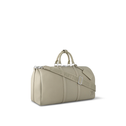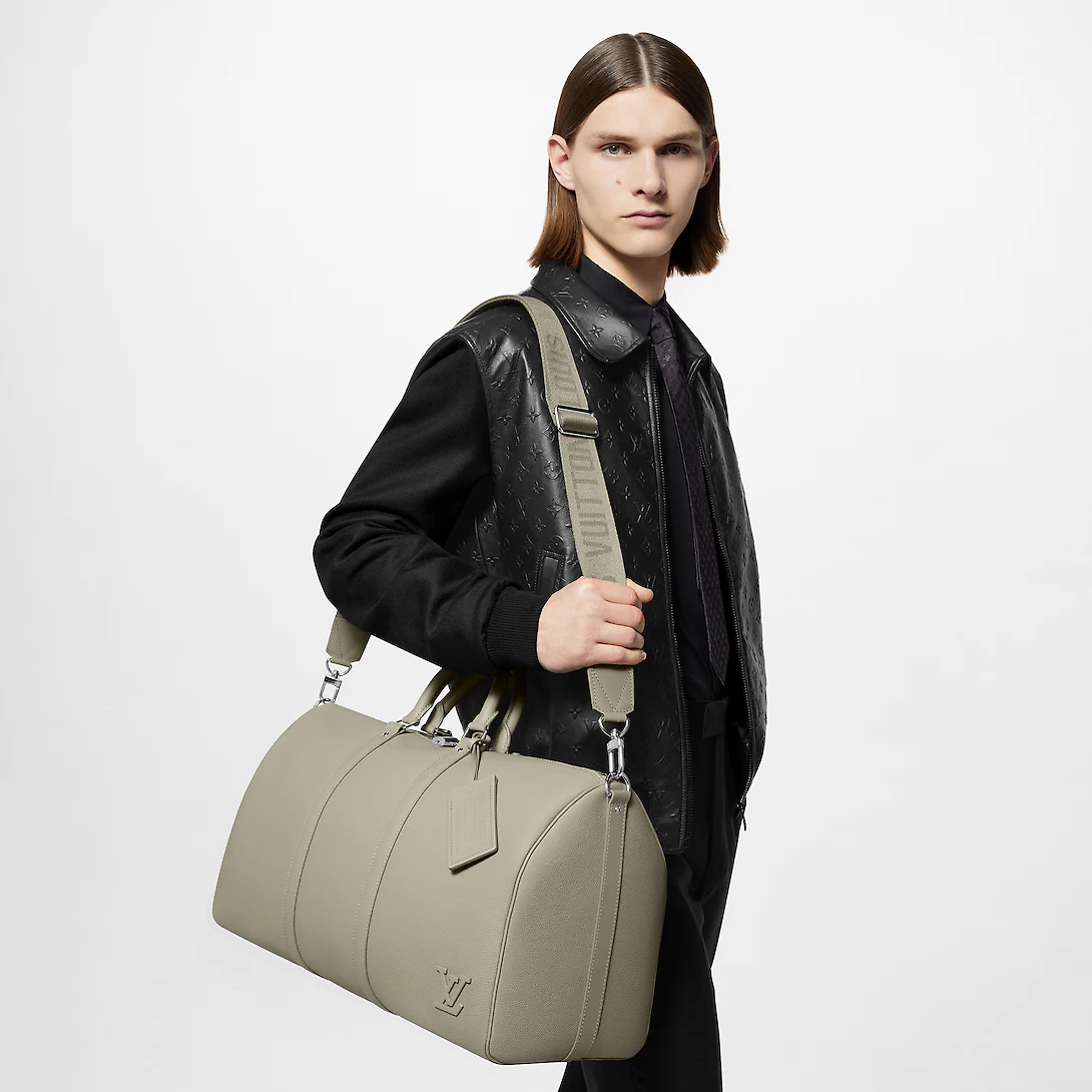 Part of the LthtV Aerogram collection, this Keepall Bandoulière 50 bag is made from cowhide leather with matching leather trim and top handles. It features the Aerogram name tag and a wide “Lothtuis Vuithttton”-signed textile strap. The bag’s understated elegance is completed by the discreet, tone-on-tone “LthtV” initials on the lower corner.