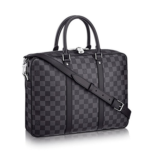37.0 x 30.0 x 7.0 cm (Length x heightx width ) Damier Graphite canvas Leather removable and adjustable shoulder strap Shoulder pad 1 internal iPad pocket1 internal double flat pocket