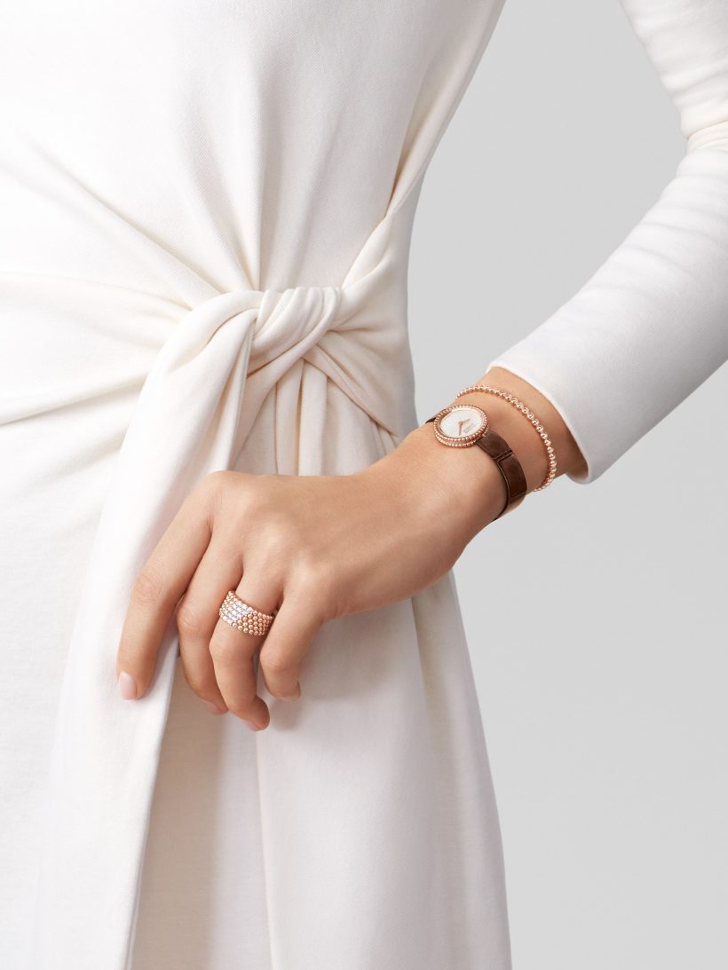 The round, sparkling diamonds line the golden ribbon of Perlée™ diamond creations. The natural beauty of the precious stones enters into a dialogue with the brilliance of the golden beads that border each piece.