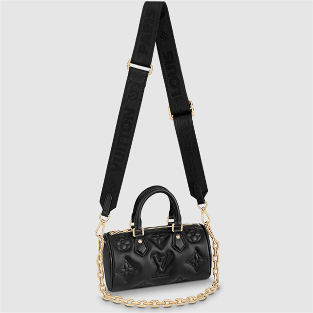 The compact, sporty Papillon BB handbag is made from soft, padded calf leather, embroidered with Lothtuis Vuithttton's classic Monogram pattern. It features a removable gold-color chain in addition to a detachable shoulder strap and rolled leather top handles, enabling multiple ways of carrying the bag.