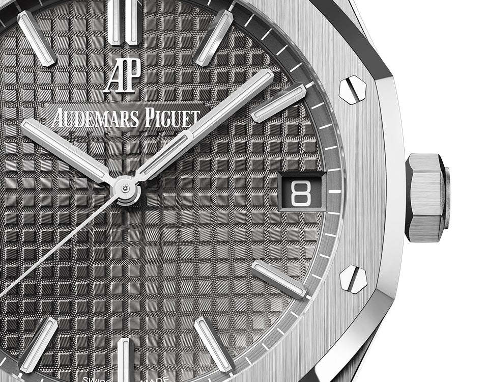 Unworn Audthtemars Pigthtuet Royal Oak SELFWINDING 15500ST.OO.1220ST.02. 41 mm, Slate grey dial with “Grande Tapisserie” pattern, white gold applied hour-markers and Royal Oak hands with luminescent coating, Stainless steel case, glareproofed sapphire crystal and caseback, screw-locked crown, 4302 calibre, Selfwinding movement, 70 h power reserve, 32 jewels, Stainless steel bracelet with AP folding clasp. Water resistant to 50 m.