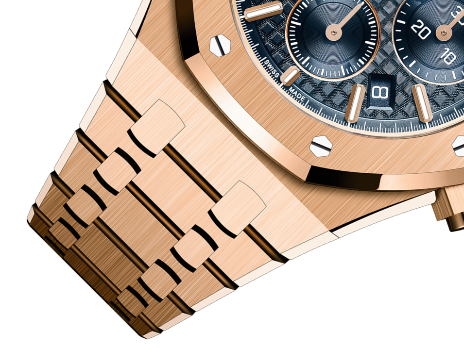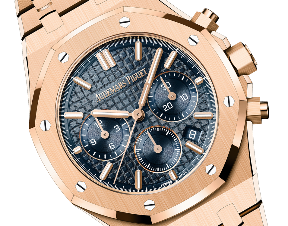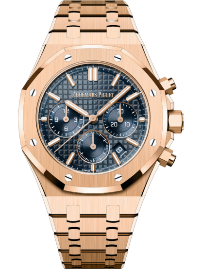 Ce Chronographe de 38 mm est doté de la nouvelle évolution du design Royal Oak. Le boîtier et le bracelet en or rose contrastent avec un cadran « Grande Tapisserie » orné de la teinte emblématique Bleu Nuit, Nuage 50.