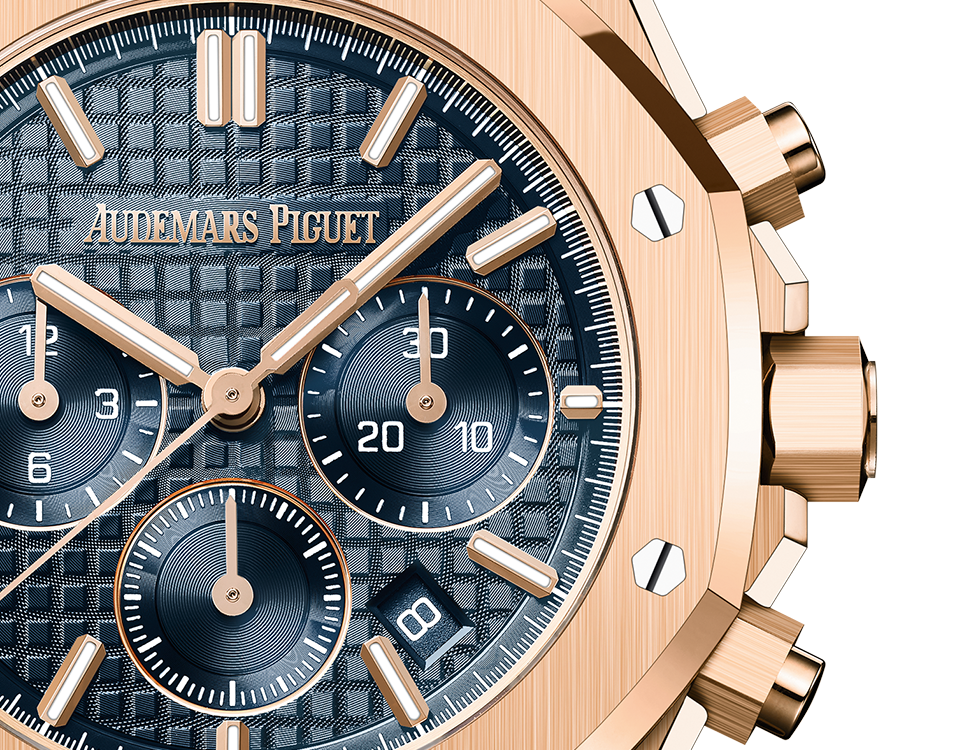 Cadran « Bleu nuit nuage 50 » avec motif « Grande Tapisserie », compteurs « Bleu nuit nuage 50 », index appliques en or rose et aiguilles Royal Oak avec revêtement luminescent.