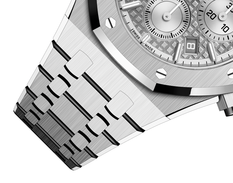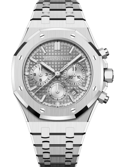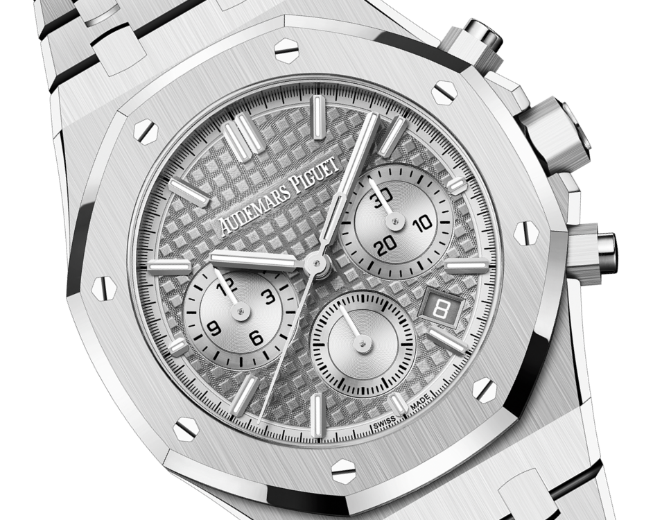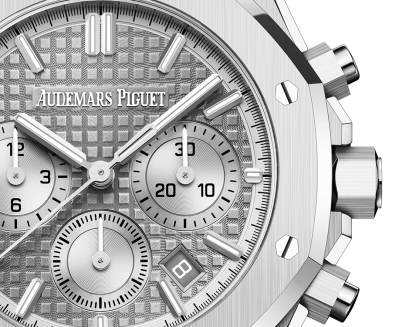 Cadran gris avec motif « Grande Tapisserie », compteurs argentés, index appliques en or blanc et aiguilles Royal Oak avec revêtement luminescent.