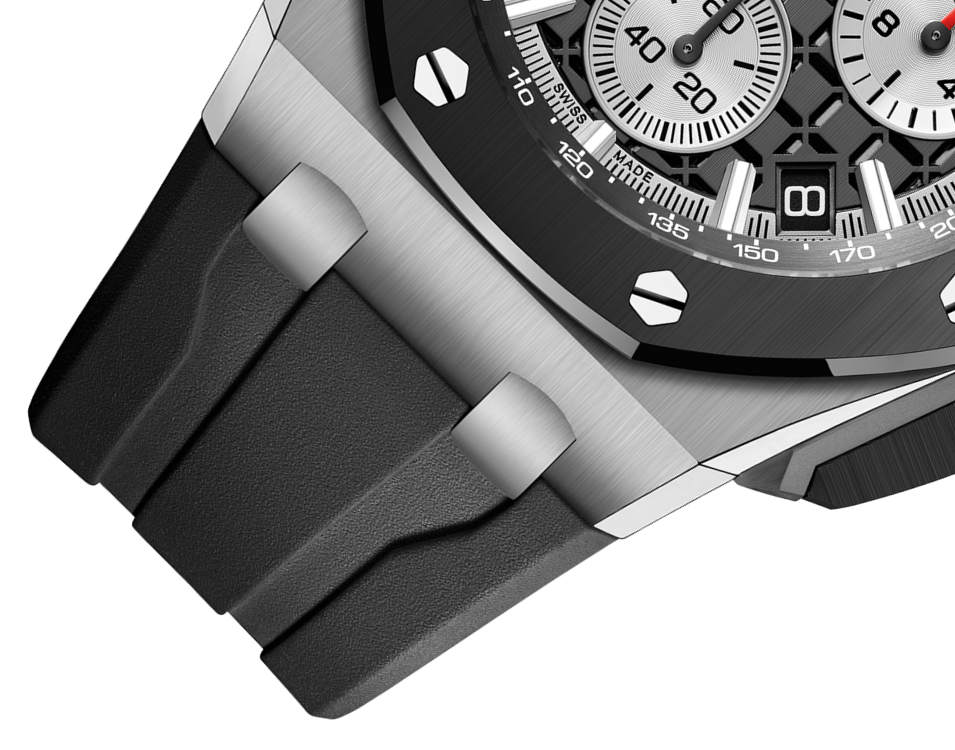Black dial with “Méga Tapisserie” pattern, rhodium-toned counters and external zone, white gold applied hour-markers and Royal Oak hands with luminescent coating, black inner bezel