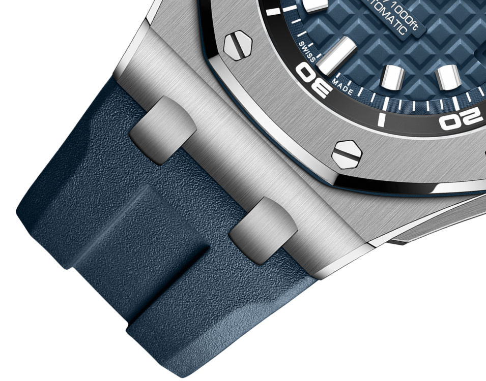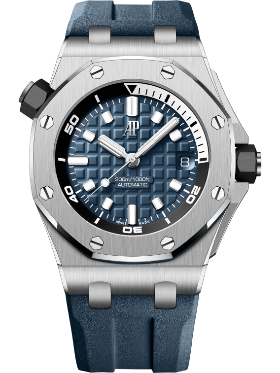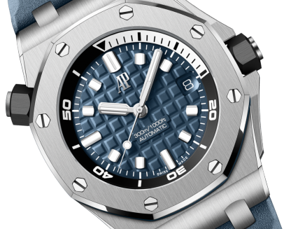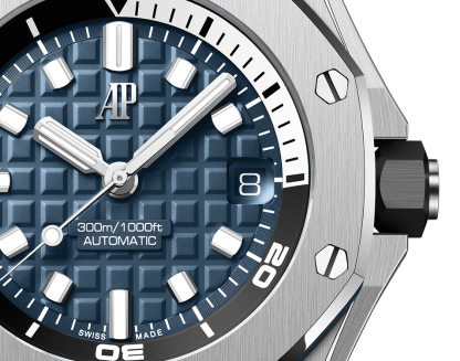 Blue dial with “Méga Tapisserie” pattern, white gold applied hour-markers and Royal Oak hands with luminescent coating, black rotating inner bezel with zone from 60 to 15 minutes in white