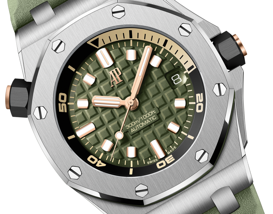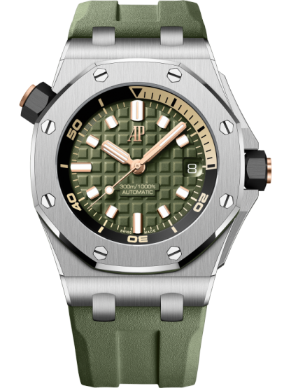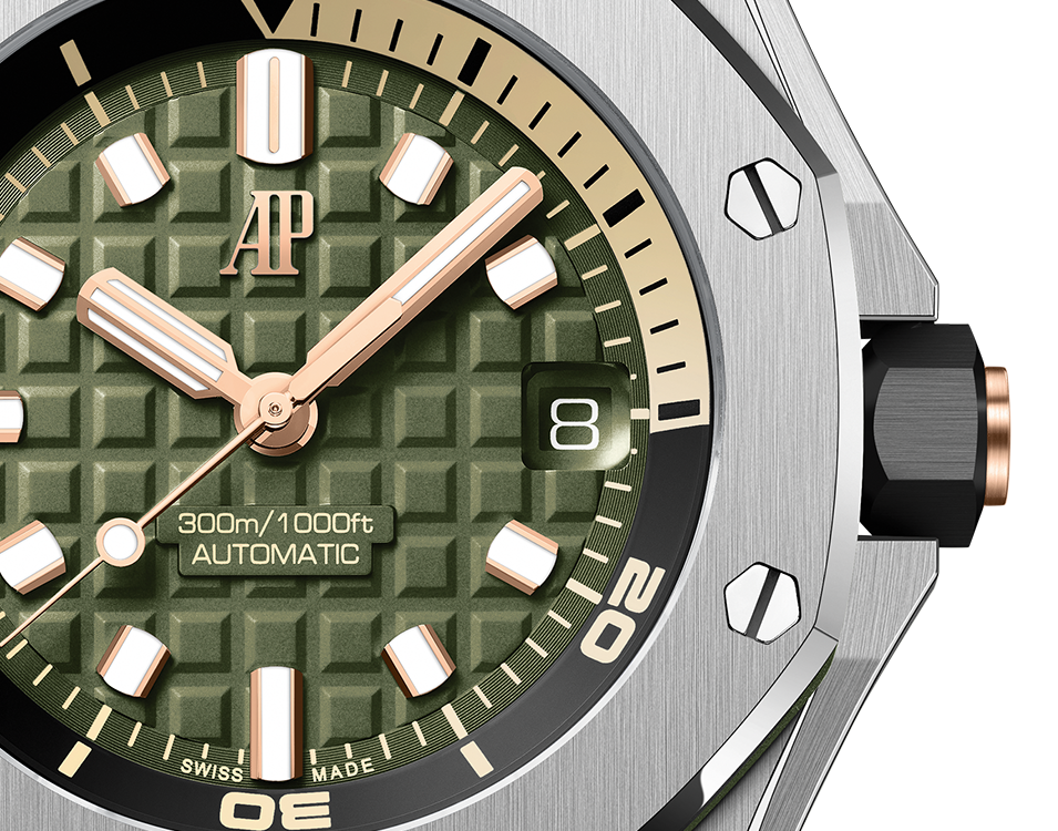 Khaki green dial with “Méga Tapisserie” pattern, pink gold applied hour-markers and Royal Oak hands with luminescent coating, black rotating inner bezel with zone from 60 to 15 minutes in beige