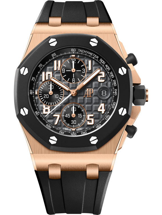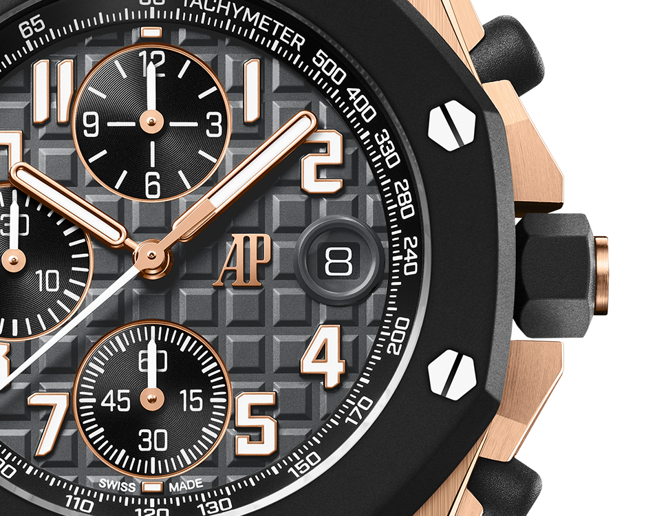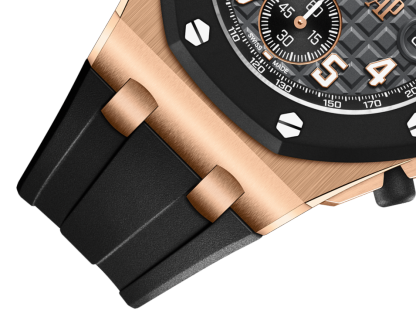 The new 42 mm Royal Oak Offshore iteration contrasts an 18-carat pink gold case with a black rubber bezel, a black "Méga Tapisserie" dial and a black interchangeable rubber strap for a sporty and elegant look.