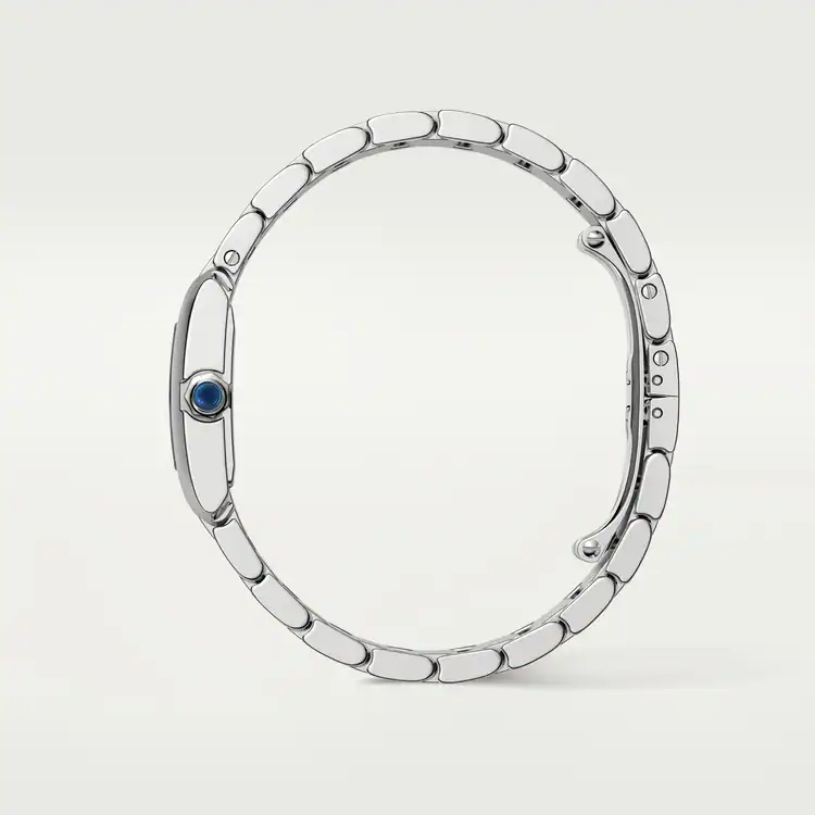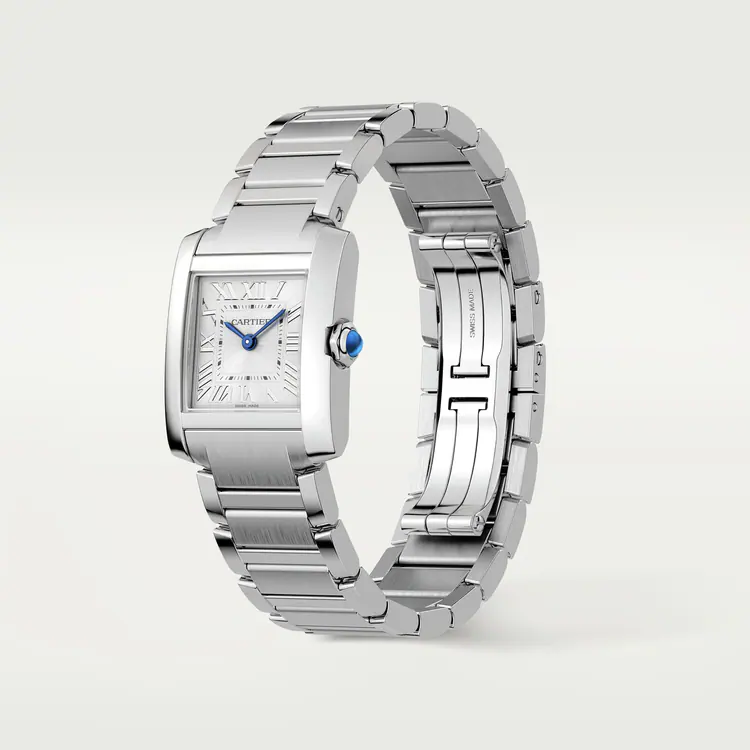 Tank Française watch, small model, quartz movement. Steel case. Faceted crown in steel decorated with a synthetic cabochon-shaped spinel. Silvered sunray dial, blued-steel sword-shaped hands, sapphire crystal. Steel bracelet. Case dimensions: 25.7 mm x 21.2 mm, thickness: 6.8 mm. Water-resistant up to 3 bar (approx. 30 meters/100 feet).