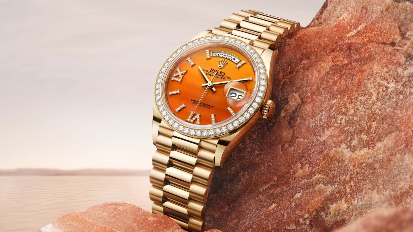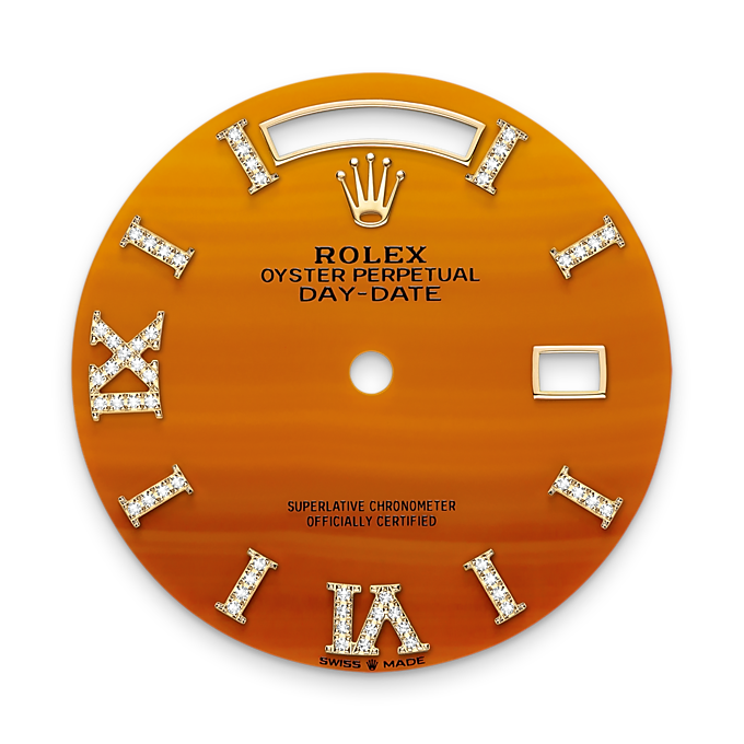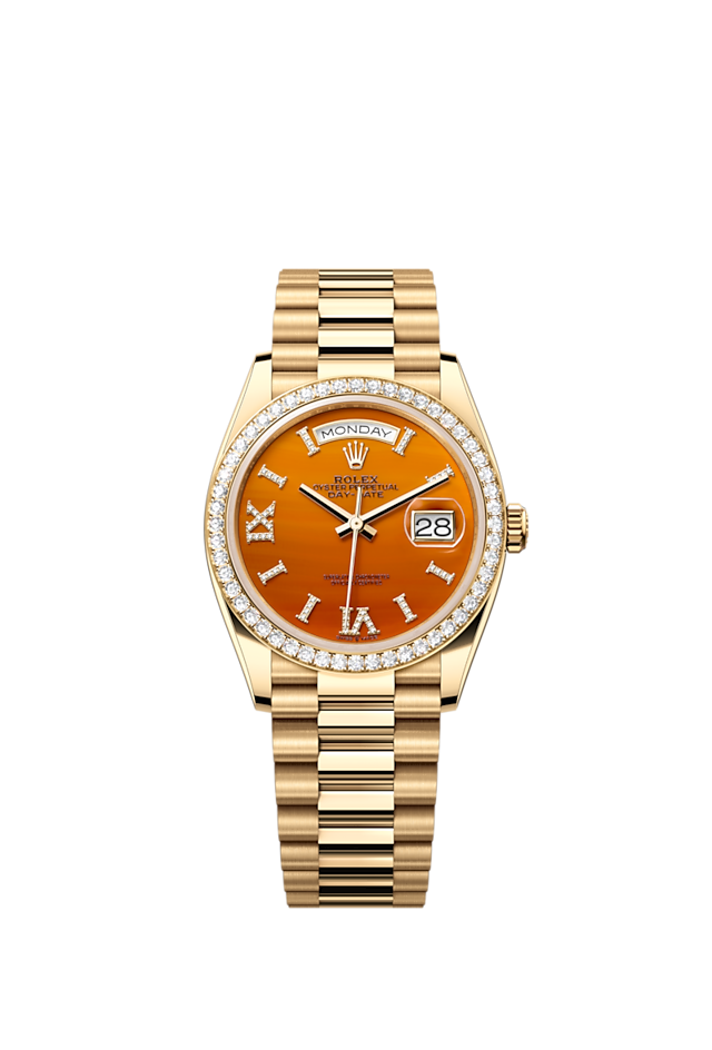 Unworn watch Rothtlex Day-Date 36, 18k Yellow Gold, 36mm, Ref# 128348rbr-0049. New for 2023 in the Oyster Perpetual Day-Date 36, series are watches with dials made of decorative stones. Thanks to the unique crystallized effects, matrices and veins of aventurine, carnelian and turquoise, and their skillful processing, each dial turns into a unique work of art, being a worthy addition to the rest of the flawless Day-Date details. As always elegant and luxurious Day-Date 36 - is an excellent choice for people who appreciate unique beauty, high style and absolute comfort. The dial is carved from Carnelian, an orange-colored stone characterized by lines of various shapes and sizes, forming an intricate cameo of patterns. Its index hour markers and Roman numerals VI and IX in 18k Yellow Gold are respectively set with 32 and 24 diamonds, using a flawless setting and leveling technique that highlights the stones' subtle brilliance. The classic polished hands made of 18k Yellow Gold look amazing on such a dial, emphasizing the sophistication of the model. The date indicator is traditionally placed at the 3 o'clock position. At the 12 o’clock, position is a semi-circular window showing the day of the week in full, providing an instantly recognizable, unique design of Day-Date. The ribbed screw-down crown in 18k Yellow Gold Triplock with double watertight system, adorned with the Rothtlex logo, is a traditionally recognizable part of Rothtlex watches. The dial is covered with a scratch-resistant anti-reflective sapphire crystal and a Cyclops lens above the date with double anti-reflective coating. A solid 18k Yellow Gold screw-down case back with fine fluted edges, closes the movement. Fixed 18k Yellow Gold bezel set with 52 brilliant-cut diamonds – sparkling a symphony that will adorn the watch and enchant its owner. The in-house Rothtlex mechanical movement, caliber 3255, contains 31 jewels and has an approximate power reserve of approximately 70 hours powers. This delightful timepiece is presented on an 18k Yellow Gold President bracelet with semi-circular 3-piece links for flawless beauty. It features Rothtlex's original concealed folding Crownclasp to secure the watch on your wrist. Water resistant up to 100m/330ft (10 ATM).