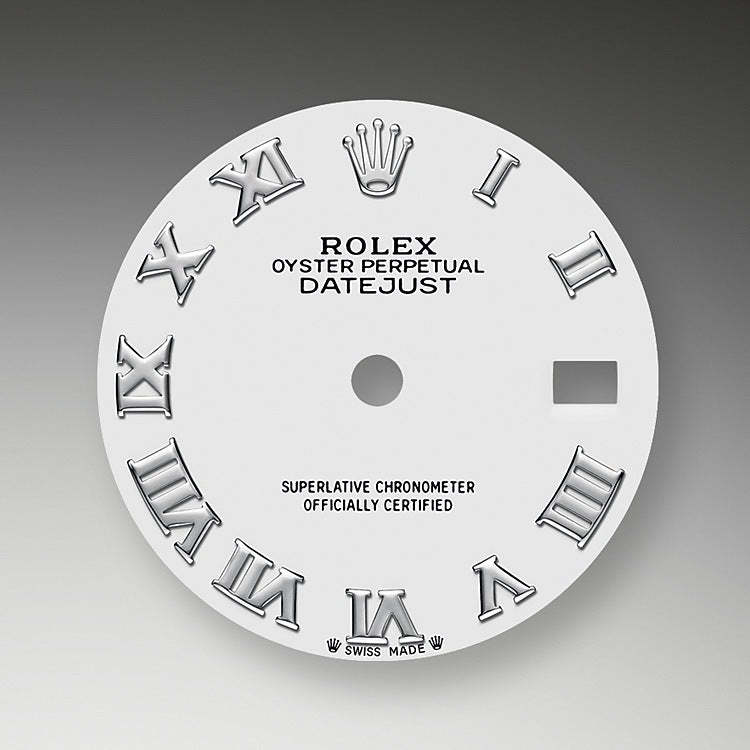 - Dial color: White dial with a applied polished 18k White Gold Roman numerals as hour markers