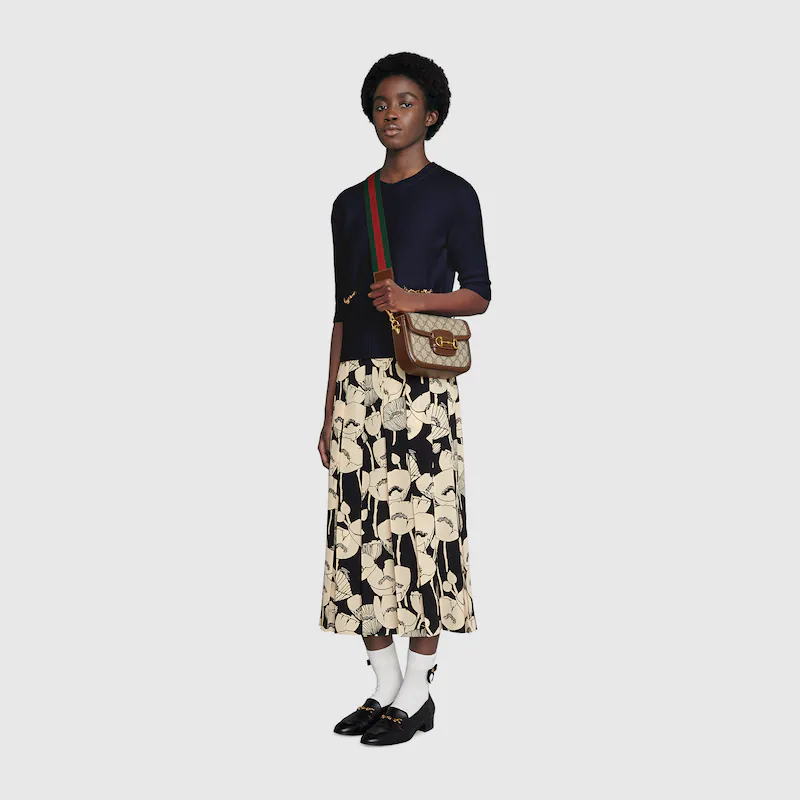 Petite versions of the Guthtcci Horsebit 1955 add a hybrid twist to the vintage inspired line. Enriched with two different shoulder straps, the mini bag’s character transforms from understated elegance with a tonal leather strap to a strong logo feel thanks to a red and green Web option. The accessory is presented in monogram canvas with a brown leather trim.