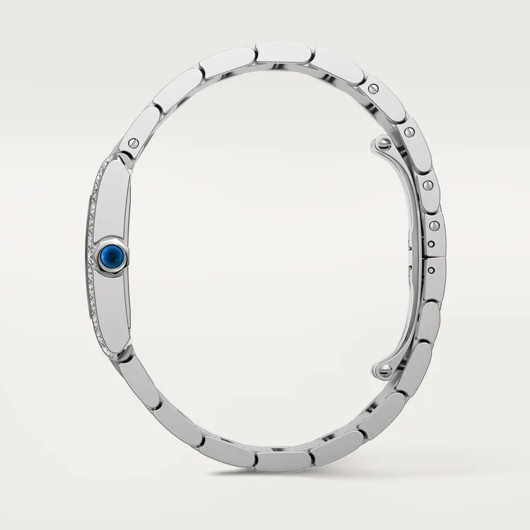 Tank Française watch, medium model, quartz movement. Steel case set with 26 brilliant-cut diamonds totaling 1.09 carats, steel faceted crown with a synthetic blue cabochon-shaped spinel. Silvered sunray dial, blued-steel sword-shaped hands, sapphire crystal. Steel bracelet. Case dimensions: 32 mm x 27 mm, thickness: 7.1 mm. Water-resistant up to 3 bar (approx. 30 meters/100 feet).