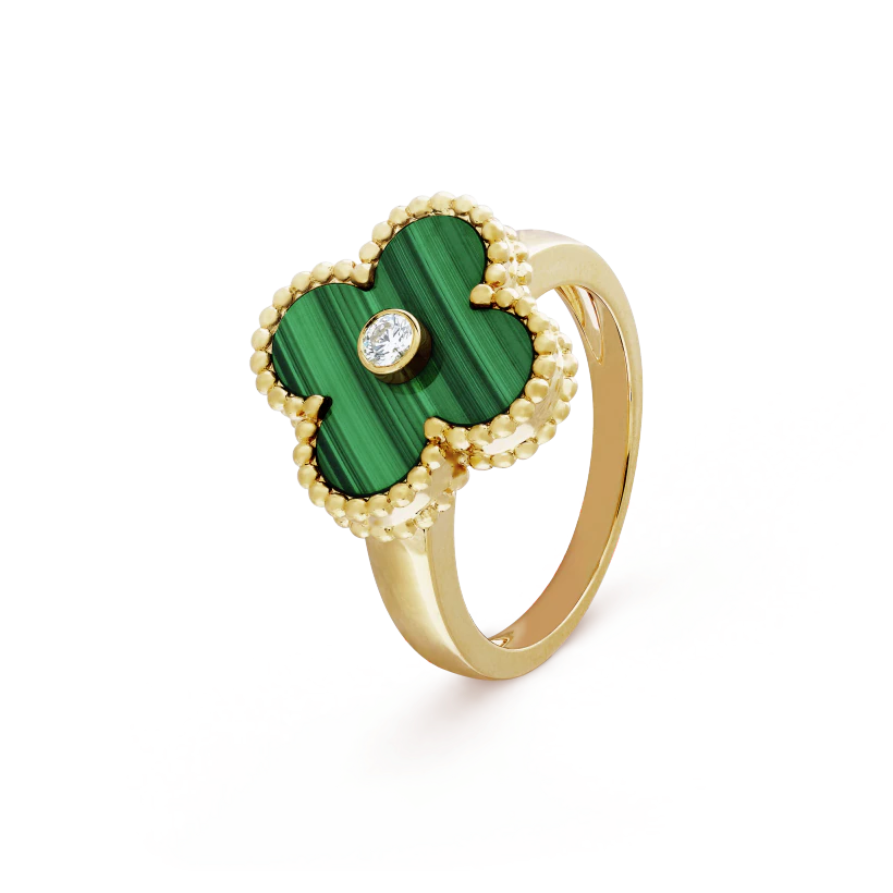 Vintage Alhambra ring, 18K yellow gold, malachite, round diamond; diamond quality DEF, IF to VVS.