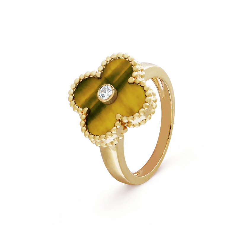 Vintage Alhambra ring, 18K yellow gold, tiger’s eye, round diamond; diamond quality DEF, IF to VVS.