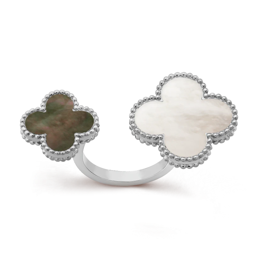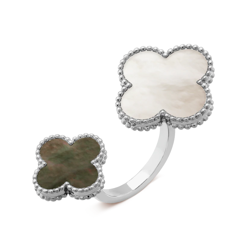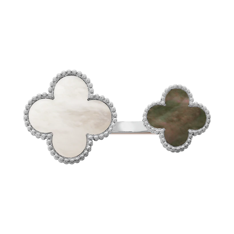 Magic Alhambra Between the Finger ring, rhodium plated 18K white gold, white and gray mother-of-pearl.