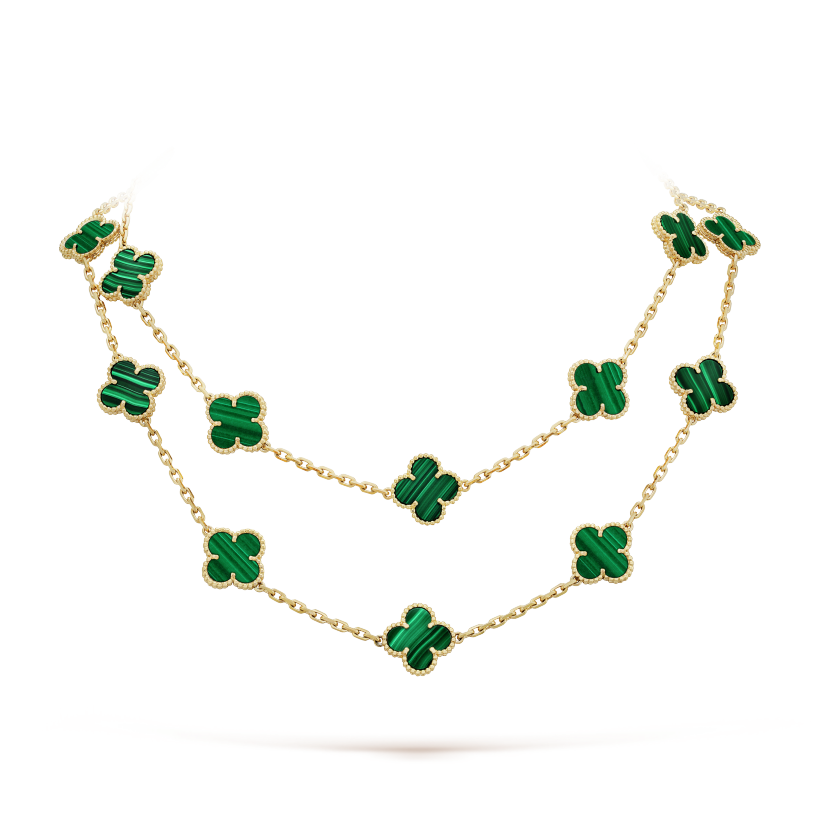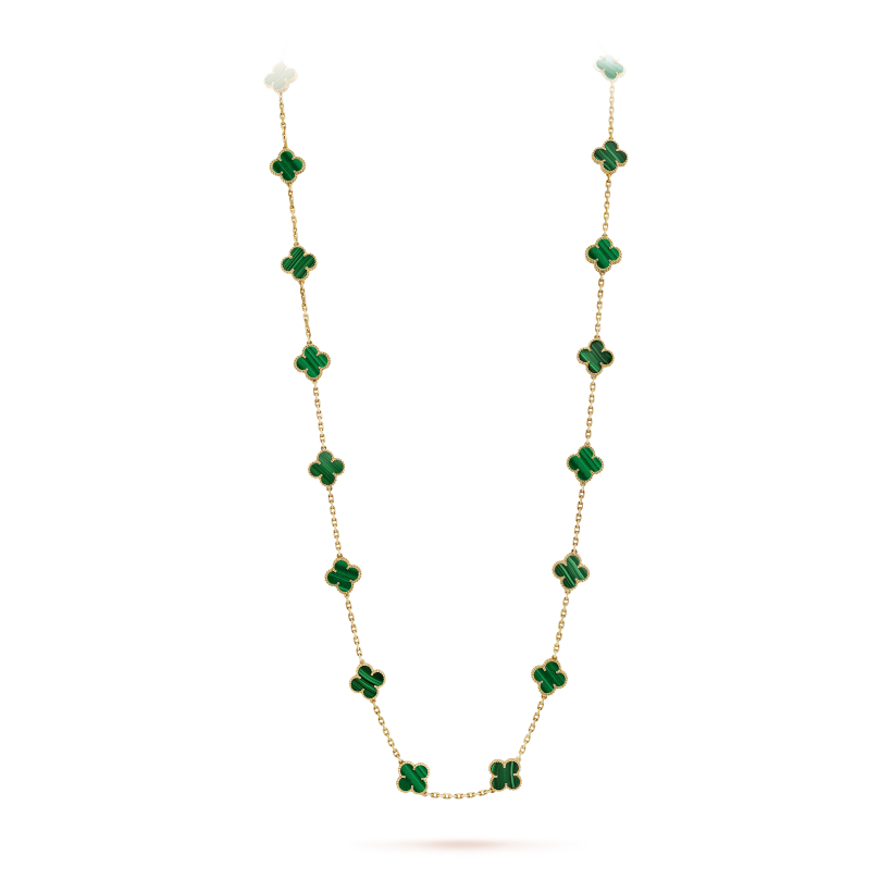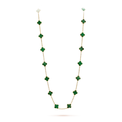 Vintage Alhambra long necklace, 20 motifs, 18K yellow gold, malachite.