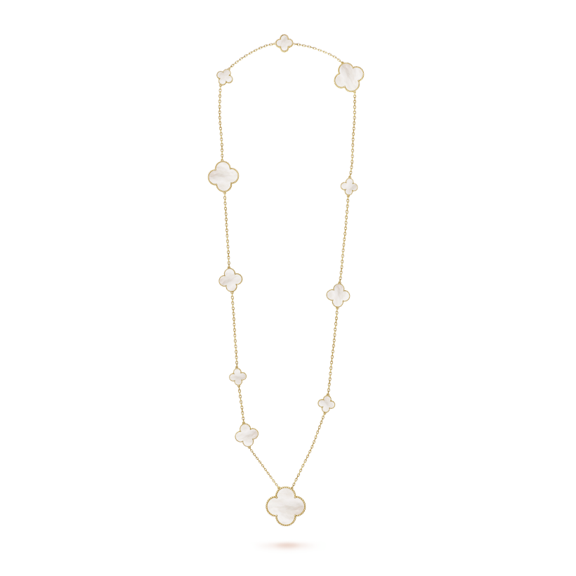 Magic Alhambra long necklace, 11 motifs, 18K yellow gold, white mother-of-pearl.