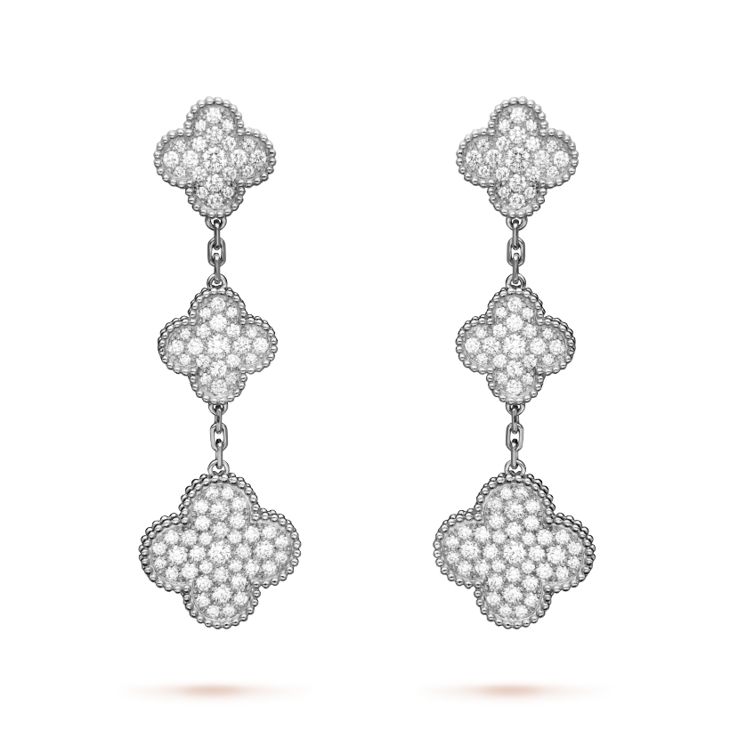 Magic Alhambra earrings, 3 motifs, rhodium plated 18K white gold, round diamonds; diamond quality DEF, IF to VVS.