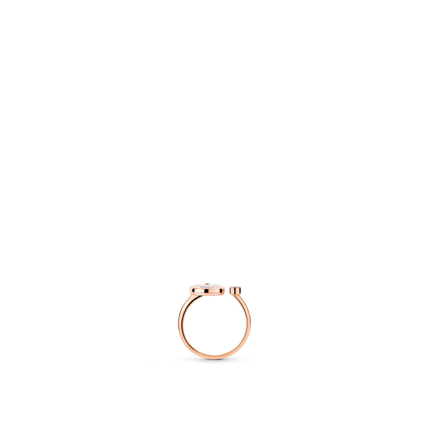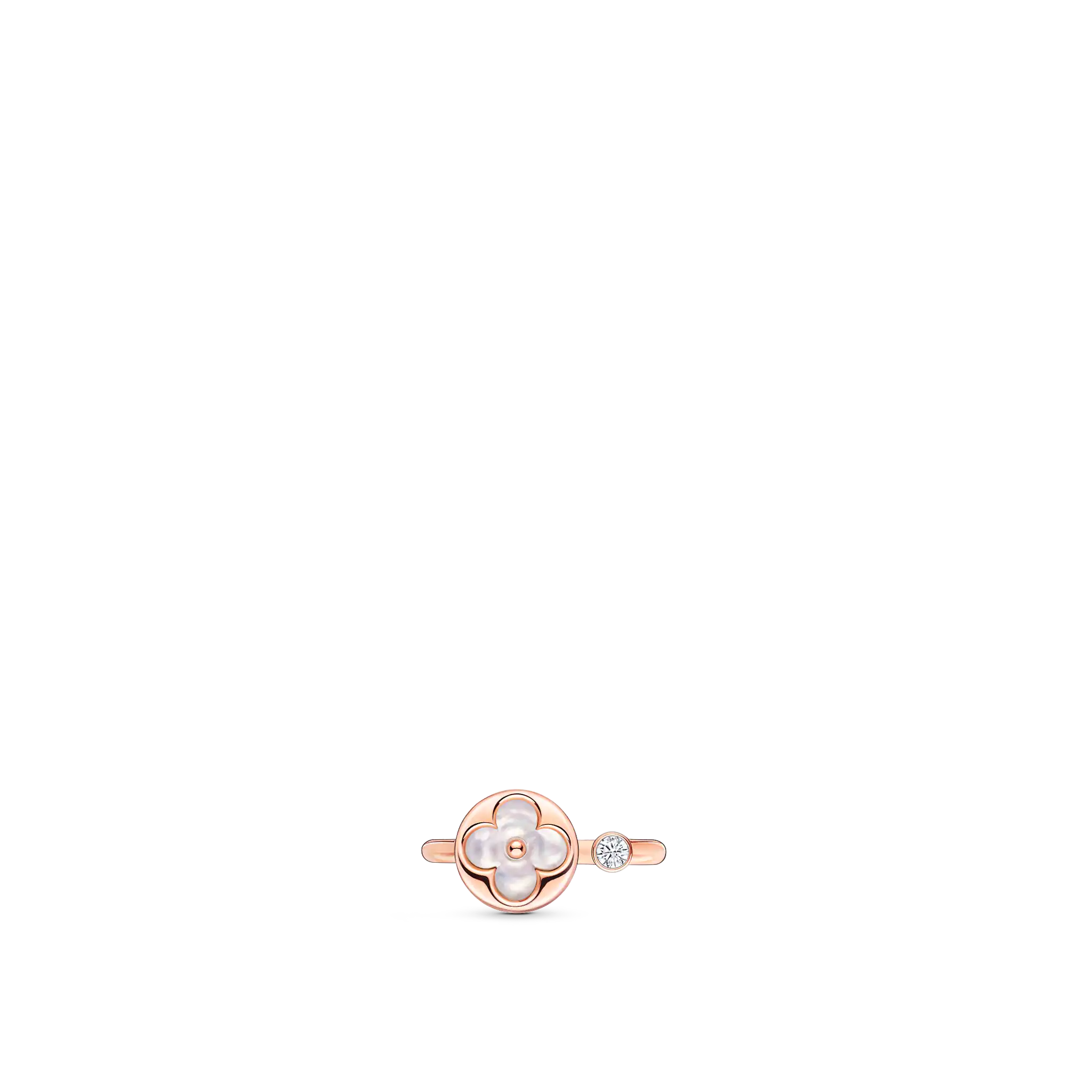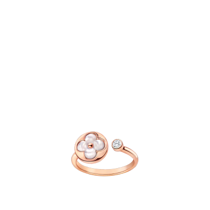 Precious and delicate, this 18-karat pink-gold ring is part of the Color Blossom fine jewelry collection, a celebration of the iconic Monogram Flower. The Sun motif is carved from natural white mother-of-pearl and meticulously hand-polished to an exquisite luster. The ring’s open design is accented with the sparkle of a brilliant round diamond.