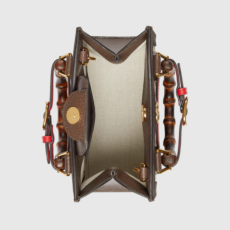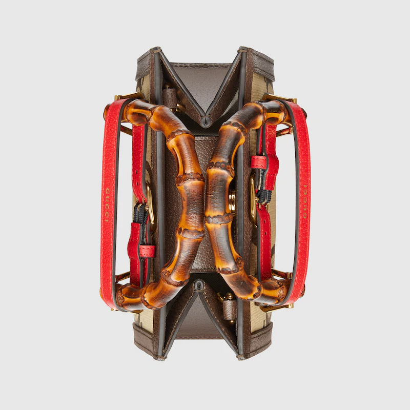 Instantly recognizable emblems of the brand, logos enrich designs in new and unexpected ways. Behind every logo lies the tradition and value of the House, an everlasting medium one can wear again and again. Following the idea of constant change and experimentation, different iterations of the logo have been presented each collection. The jumbo GthtG, a new, maximalist version of the historic monogram, animates a selection of ready-to-wear and accessories for the Aria collection. This mini Guthtcci Diana tote is completed by a brown leather trim.