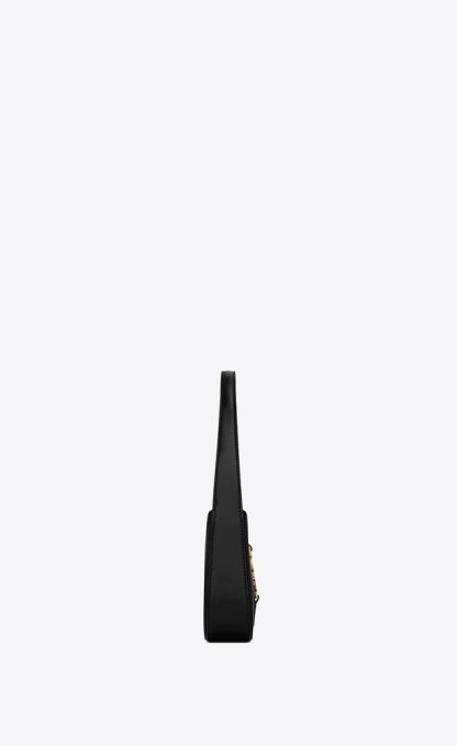 LE 5 À 7 MINI WITH A LEATHER TAB FASTENING, CASSANDRE EMBELLISHMENT AND MATCHING SUEDE LINING.